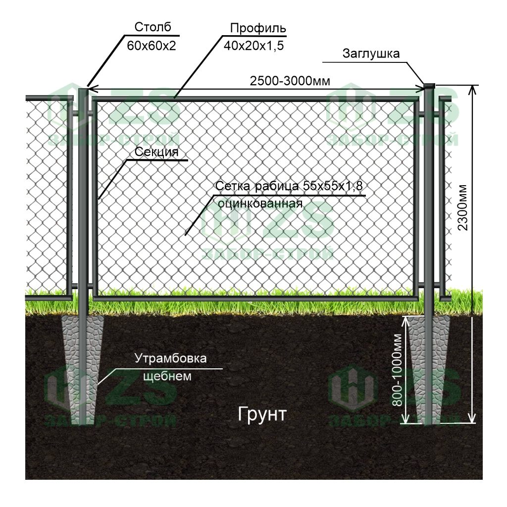 Конструкция забора из сетки рабицы на профилированном каркасе: